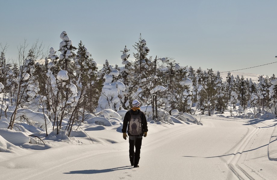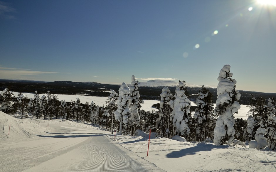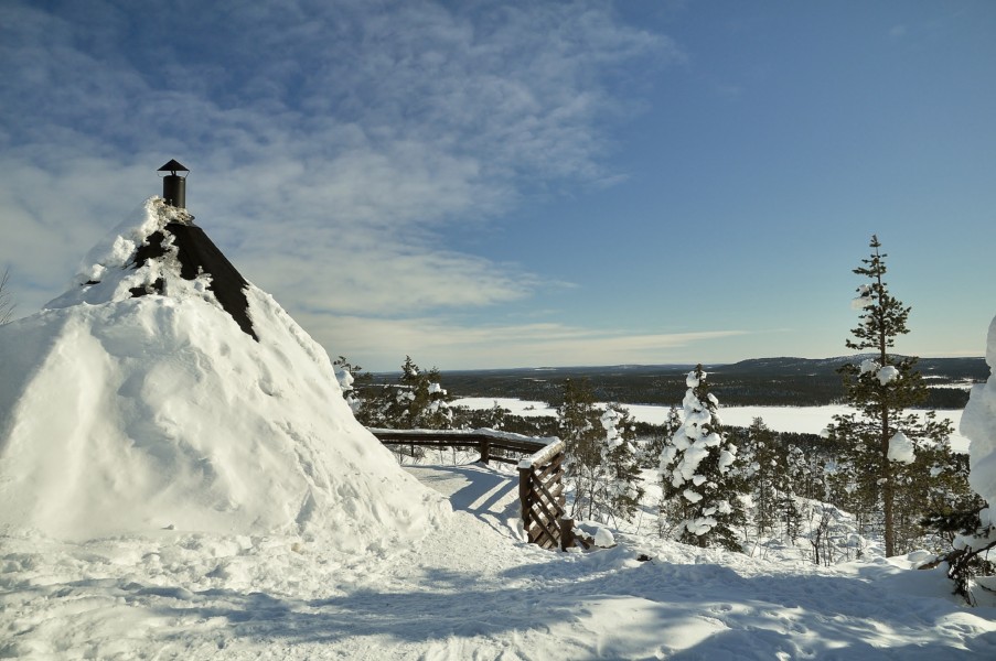Le dernier jour, nous avons choisi de nous promener à pied en direction d’un point de vue : à Jyppira. L’itinéraire est balisé et il y a des plans disponibles sur des panneaux un peu partout. Une photo et hop c’est bon, vous vous retrouverez ! Nous sommes montés par les pistes de ski de fond. Ce n’est pas très autorisé je crois par contre… Séances observation d’un lagopède, admiration des arbres encore un peu meringués, admiration (encore !) de la vue à couper le souffle ! Une vue dégagée sur le parc national d’Yllas en face et sur le lac d’Hetta. Ouaaaaahh !