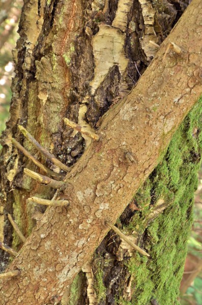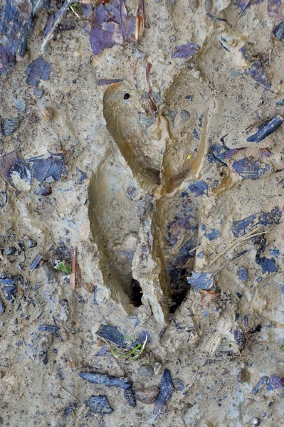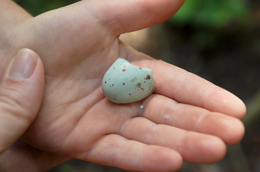 La randonnée commence par un chemin en forêt, facilement identifiable. Le chemin est emprunté par les engins forestiers, il est défoncé… En plus, il est très humide, ce qui n’arrange rien ! On profite de cette traversée forestière pour découvrir la beauté de la nature : explication des roches (car là c’est du schiste et ce type de pierre est moins fréquent pour nous), des arbres (les différents types de feuilles, d’écorces, les trous des pic-verts…), des coquilles d’oeufs d’oiseaux (là c’est un merle), des traces des animaux… Bref, parfait pour jouer au petit pisteur !