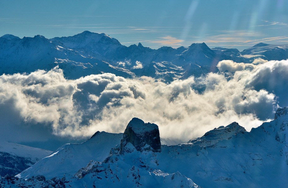 Je termine par le sommet le plus célèbre des Alpes. Le toit de France et de l’Europe , les 4807 m du Mont Blanc sont visibles de très loin ! Notre regard est attiré, dès qu’il apparait : « Oh, on voit le Mont Blanc ». Ce n’est pas le seul sommet qui est esthétique, mais selon les points de vue, le Mont Blanc du Tacul et le mont maudit le complète (les 3 monts), ou le dôme du goûter. Paradoxalement, je ne rêve pas de gravir le Mont Blanc. C’est désormais trop fréquenté et mon côté ours me fera préférer des lieux plus confidentiels.