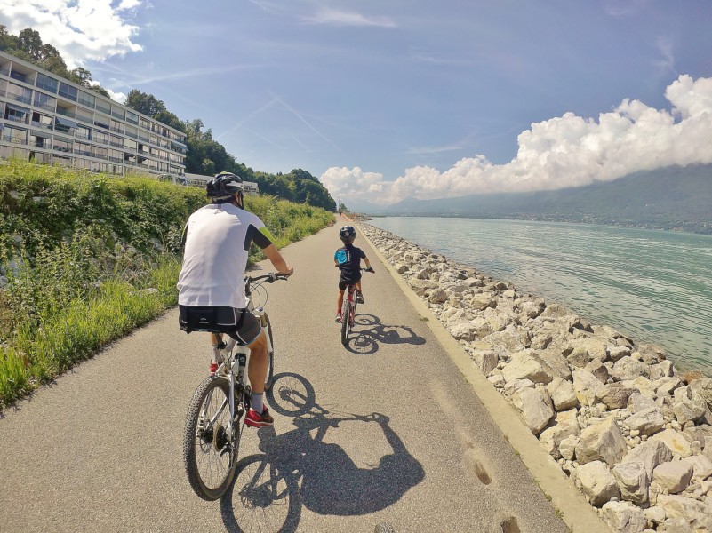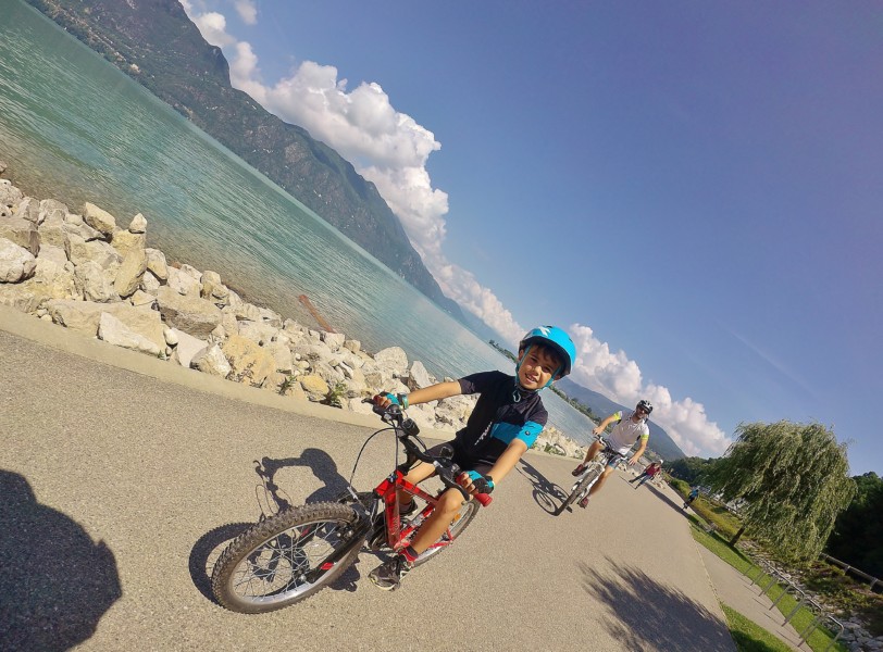 Thibaut participe avec son équipe (ou son gang comme il l’appelle) à la journée des débutants de foot. Elle a lieu à Aix les bains. Arthur nous demande alors de faire du vélo ! Compliqué en logistique, mais bonne idée ! Nous voilà avec nos vélos sur la voiture ( les 3 vélos de Papa, Maman et Arthur) car le coffre est déjà bien plein des affaires de la fête d’anniversaire sur laquelle on enchaîne !