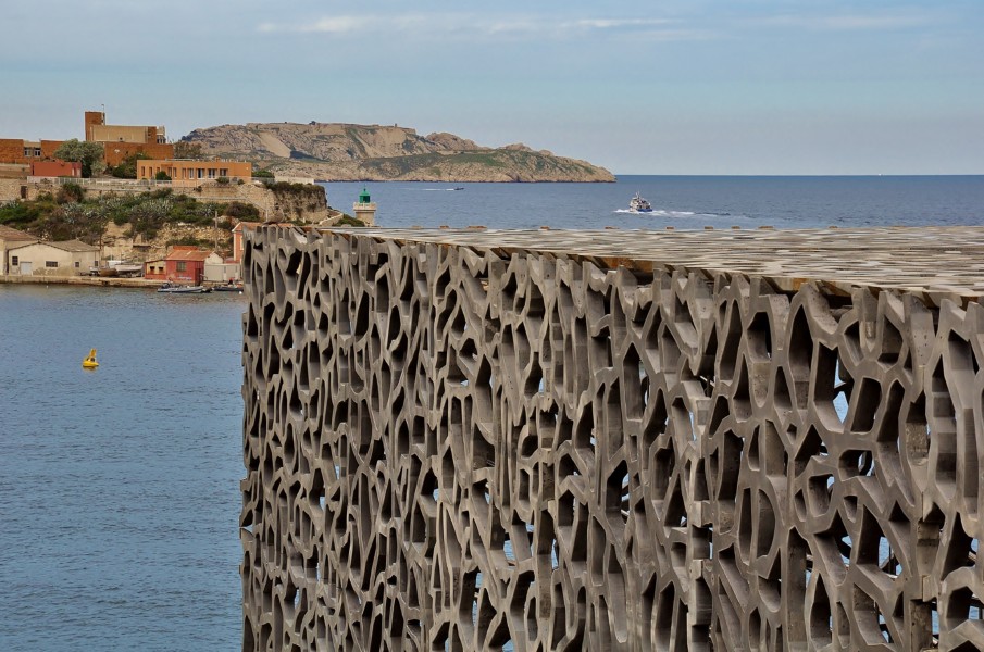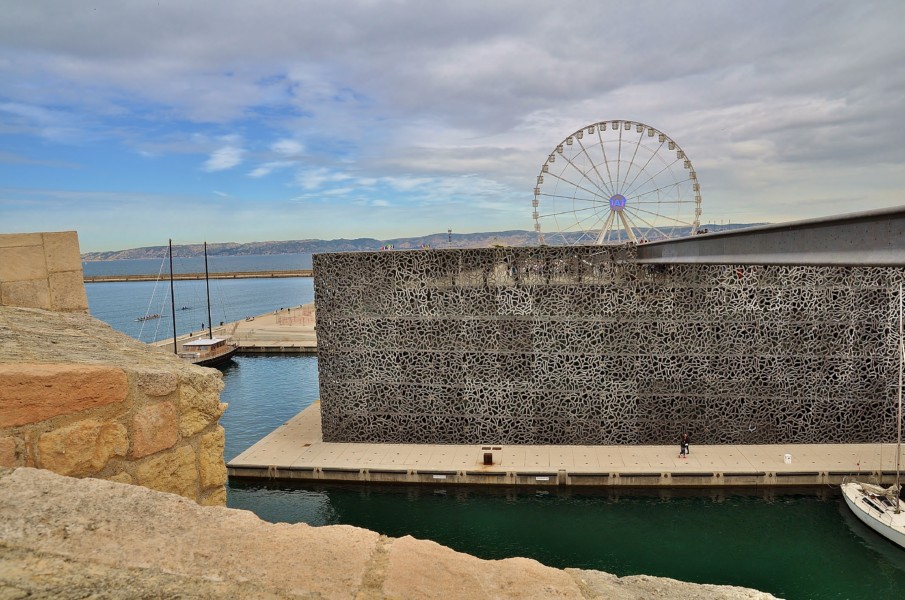 Avant de repartir vers notre savoie, nous avions 2 heures de balade. Direction le Vieux Port côté Mucem à Marseille ! Après avoir admiré la bonne mère, on s’extasie devant ce musée. Je n’avais pas encore vu le réaménagement de cette zone, et je trouve cela très réussi. L’architecture du Mucem vaut le coup d’œil. C’est bien fait, car on peut très bien en profiter sans visiter la collection du musée. Nous n’avions pas le temps de visiter les collections, alors l’extérieur nous suffisait ! Cette dentelle de béton fait rêver monsieur Papa … 😀