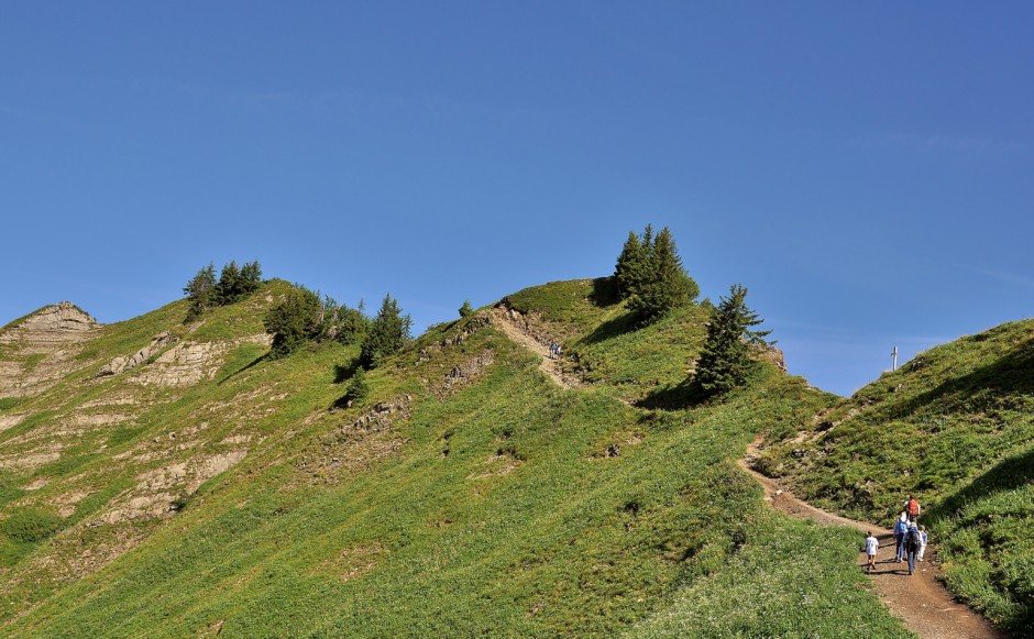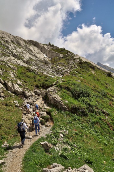 On continue sur une arête facile, qui offre une vue sur les deux vallées : côté Grand Bornand et côté Reposoir. On descend une toute petite partie câblée qui ne présente pas de grandes difficultés , avant d’arriver au col de l’Oulettaz.