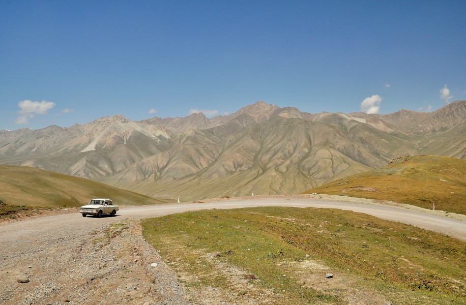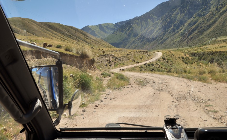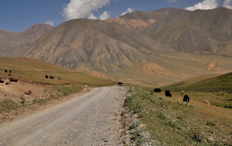 La vallée de Barskoon constitue la route d’accès à une mine d’or. Du coup, la route est bien : c’est une piste, non poussiéreuse. Comment font-ils ?? C’est simple, un camion passe toutes les heures en arrosant :-O ! Vladimir nous dit qu’il y a du progrès car avant, ils faisaient cela avec de l’huile pour que cela dure plus longtemps… Je n’imagine pas l’état du sous-sol…