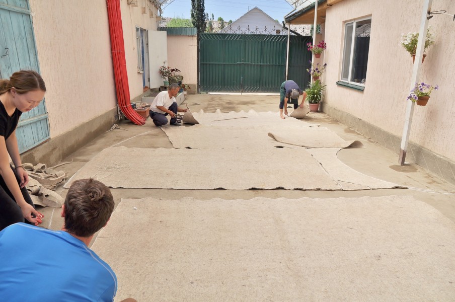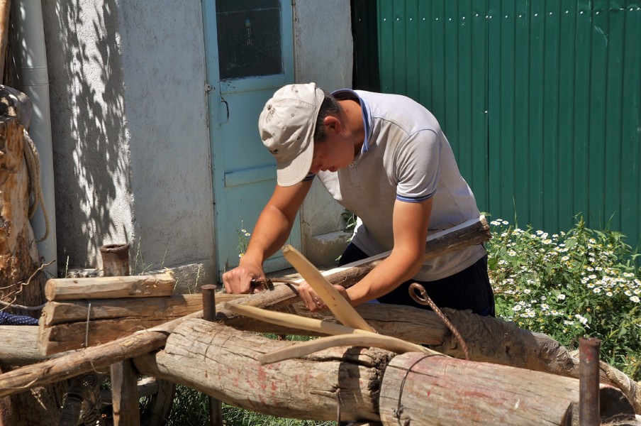 Au village de Kara Kou, Vladimir nous a proposé de visiter la maison/fabrique d’une famille qui fabrique des yourtes. Tout est fait à la main ! La plus grande des filles nous explique en anglais les différentes étapes de la fabrication d’une yourte : la taille du bois, sa mise en forme, son « traitement thermique », sa peinture, la découpe du tissu en feutre, sa décoration. C’est intéressant à voir !
