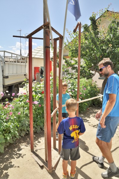 C’était notre première halte du voyage, nous avons déjà à nous faire au dépaysement ! Nous faisons le premier jour, une balade autour de notre guesthouse. Le second jour, Vladimir nous fait découvrir un petit lac le long de la route d’un col. Nous n’avons pas l’habitude pour les randonnées : on va où bon nous semble ! Donc là, on va s’attaquer à la montagne au dessus de nous ! 😀 Cela nous parait accessible, mais finalement c’est très raide car il n’y a que des chemins de chèvre ! On avance jusqu’à avoir bien faim, et du coup demi tour pour rejoindre le 4×4 et le pique nique. On poursuit tranquillement à jouer au bord de l’eau, à se baigner pour les garçons :-O et moi à me promener sur la route du col.