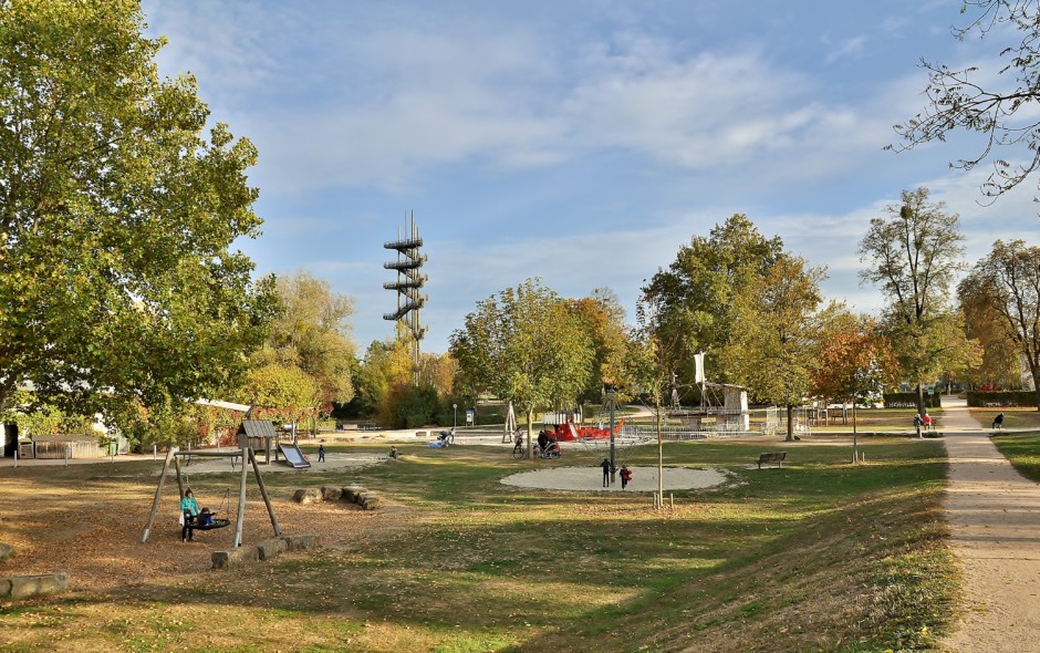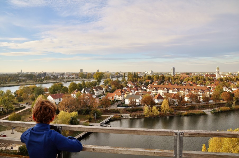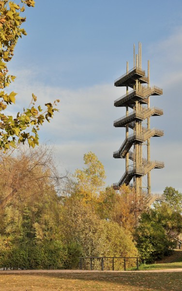 Sur la rive allemande, on retrouve des jeux aussi (je ne sais pas pourquoi on est attiré…) qui sont vraiment tops aussi ! Nous avons grimpé dans la tour d’observation également, qui permet un panorama à 360°. Le défi (et exercice de maths !) a été de compter les marches ! Il a bien fallu être 3 et la montée/descente pour tomber d’accord…